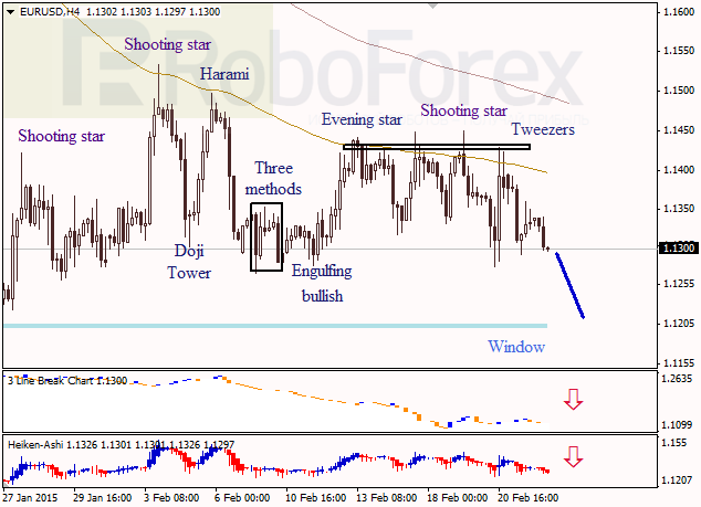 At the H4 chart of EUR USD, the price has formed Shooting Star and triple Tweezers patterns near the Moving Average, which means that a descending movement may continue. Three Line Break chart and Heiken Ashi candlesticks are also reversing downwards.