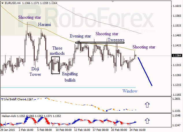 At the H4 chart of EUR USD, the price has formed Shooting Star and triple Tweezers patterns near the Moving Average, which means that a descending movement may continue. Three Line Break chart and Heiken Ashi candlesticks indicate a short-term correction.As we can see at the H1 chart of EUR USD, the price has formed Evening Star pattern. Later, the pair may fall towards the lower Window and even break it, which is confirmed by a descending movement indicated by Three Line Break chart and Heiken Ashi candlesticks.