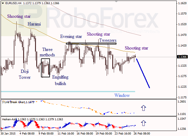 At the H4 chart of EUR USD, the price has formed Shooting Star and triple Tweezers patterns near the Moving Average, which means that a descending movement may continue. Three Line Break chart and Heiken Ashi candlesticks indicate a short-term correction.As we can see at the H1 chart of EUR USD, the price has formed Evening Star pattern. Later, the pair may fall towards the lower Window and even break it, which is confirmed by a descending movement indicated by Three Line Break chart.
