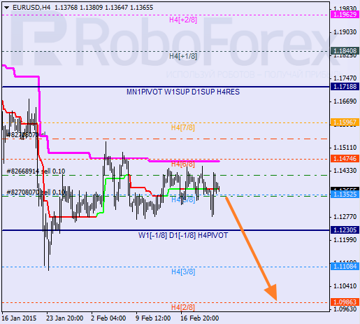 Euro is still being corrected below the H4 Super Trend. The lines at the chart have been redrawn and right now the closest target is at the 2/8 level. If the market breaks it, it may continue falling and reach the 0/8one. I’m planning to move my stop losses after the market.As we can see at the H1 chart, the market has rebounded from the 7/8 level three times, which means that it may resume falling. Earlier, Super Trends formed “bearish cross”. I’m planning to increase my short position as soon as the pair is able to stay below the 3/8 level.