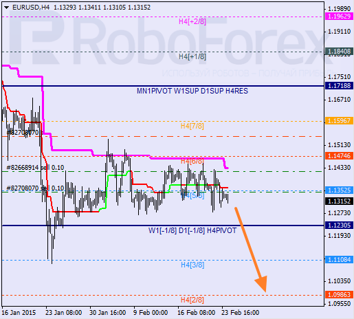 Euro is still being corrected below Super Trends. The closest target is at the 2/8 level. If the market breaks it, it may continue falling and reach the 0/8 one. Later, after the price breaks the minimum, I’m planning to move my stop losses after the market.As we can see at the H1 chart, the market has rebounded from the 7/8 level three times, which means that it may resume falling. Earlier, Super Trends formed “bearish cross”. I’m planning to increase my short position as soon as the pair is able to stay below the 3/8 level.