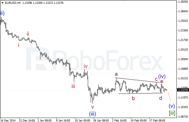 The situation hasn’t changed much over the last 24 hours. Most likely, the price has completed horizontal triangle inside wave (iv) of [iii] and in the nearest future may start a new descending movement inside wave(v) of [iii].The pair is moving below its critical level of 1.1428 and forming first ascending impulses inside wave (v) of [iii]. The structure of the new descending movement isn’t quite clear so far, but the main scenario remains the same.