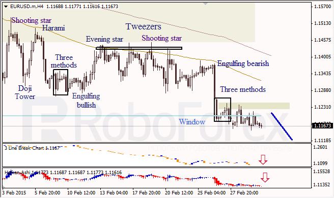 The H4 chart of EUR USD shows a sideways correction within the downtrend. Three Methods continuation pattern is a resistance level. Three Line Break chart and Heiken Ashi candlesticks confirm that the downtrend continues.As we can see at the H1 chart of EUR USD, the price is being corrected inside the lower Window. Three Line Break chart confirms a descending movement; Heiken Ashi candlesticks indicate that an ascending correction may continue.