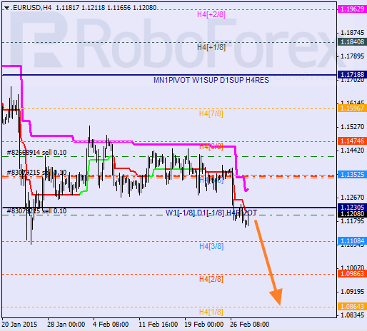 Euro is trying to continue its descending movement, which it started last week. The price has broken the 4/8level, and if later bears are able to stay below the 3/8 level, the market may continue falling towards the 1/8one.As we can see at the H1 chart, after breaking the 0/8 level, the pair is trying to stay inside “oversold zone”. During a local correction last Friday, I opened an additional sell order. In the future, the price may break the-2/8 level. In this case, the lines at the chart will be redrawn.