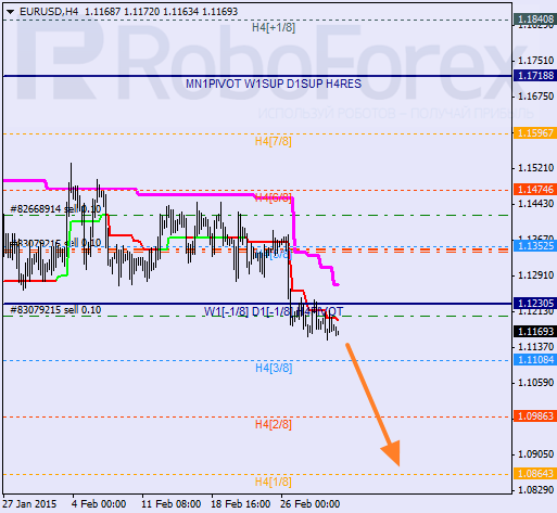 Euro is moving near its local lows. The price has broken the 4/8 level and stayed below it, and if later bears are able to stay below the 3/8 level, the market may continue falling towards the 1/8 one.As we can see at the H1 chart, after breaking the 0/8 level, the pair is moving inside “oversold zone”. Earlier during a local correction, I opened an additional sell order. In the future, the price may break the -2/8 level. In this case, the lines at the chart will be redrawn.