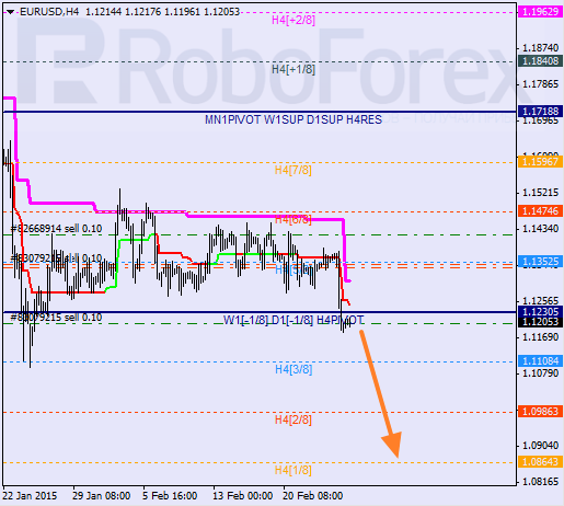 Euro has left its month-long consolidation channel by making a fast descending movement. The price has broken the 4/8 level, and if later bears are able to stay below the 3/8 level, the market may continue falling towards the 1/8 one.As we can see at the H1 chart, after breaking the 0/8 level, the pair is trying to stay inside “oversold zone”. During a local correction, I opened an additional sell order. In the future, the price may break the -2/8 level. In this case, the lines at the chart will be redrawn.