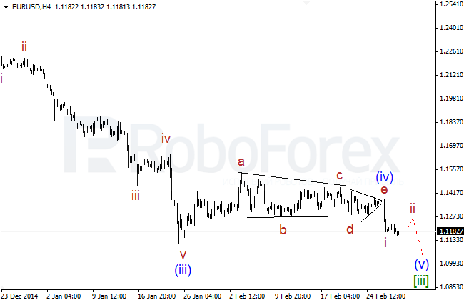 After finishing horizontal triangle inside wave (iv) of [iii], Euro has formed the first five-wave structure of a larger descending impulse inside wave (v) of [iii]. Most likely, by now the market has completed only the first wave i of (v) of [iii], and at the moment the price is expected to start a correction.After making a fast descending movement and leaving horizontal triangle inside wave i of (v) of [iii], the price is probably forming a correction inside wave ii of (v) of [iii], which may take the form of flat.